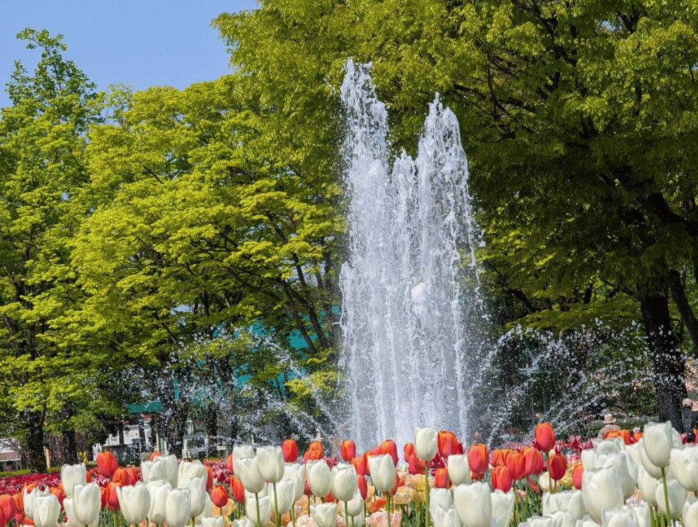 噴水とチューリップ・・・。